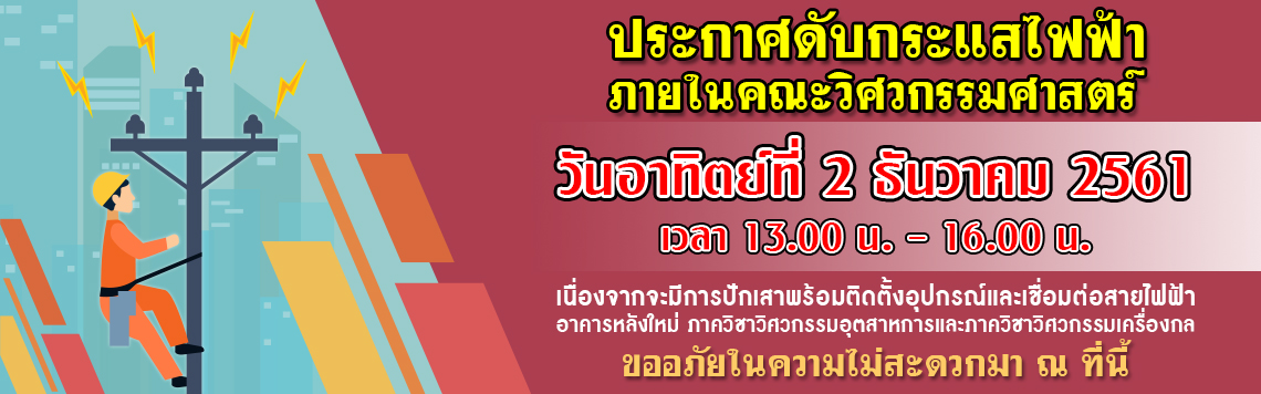 ประกาศ : ดับไฟฟ้าภายในคณะวิศวกรรมศาสตร์ วันอาทิตย์ที่ 2 ธันวาคม 2561 เวลา 13.00-16.00 น.
