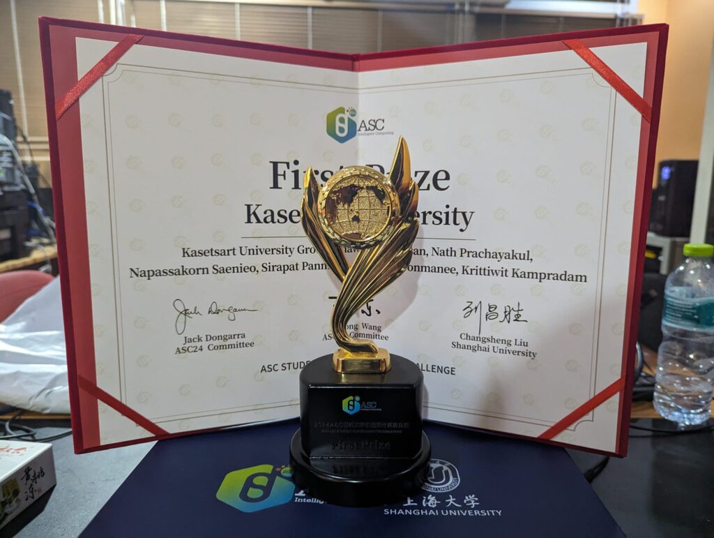 นิสิตภาควิชาวิศวกรรมคอมพิวเตอร์ ประกอบด้วย นายณัฏฐ์ ปรัชญกุล นายนภัสกร แซ่เนี้ยว นายสิรภัทร ปันมูล นายอนวัช มูลมณี และนายกฤติวิทย์ คำประดำ โดยมี อ.ดร. ชวณัฐ นาคะสันต์ เป็นที่ปรึกษาและผู้ควบคุมทีม ได้รับรางวัล First Prize จากการแข่งขัน ASC Student Supercomputer Challenge คณะกรรมการการแข่งขันประกอบด้วย Professor Jack Dongarra และคณะ ที่นครเซี่้ยงไฮ้ สาธารณรัฐประชาธิปไตยประชาชนจีน เมื่อวันที่ 13 เมษายน พ.ศ. 2567